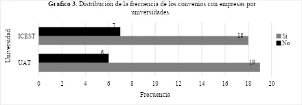 En cuanto a convenios con empresas, 18 de los egresados del ICEST mencionaron que su universidad contaba con estos acuerdos, mientras que en la UAT esta proporción fue ligeramente mayor, alcanzando 19, esto indica un acceso comparable a oportunidades de vinculación profesional desde ambas instituciones.