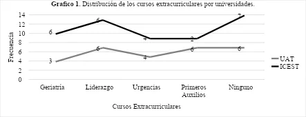 En los cursos extracurriculares ambas universidades integraron cursos de Geriatría, liderazgo, urgencias y primeros auxilios, de los cuales los mayormente solicitados por la UAT fueron liderazgo (6) y primeros auxilios (6) y por el ICEST Geriatría (6) y liderazgo (6), sin embargo la gran mayoría del ICEST no selecciono ningún curso extracurricular (7).