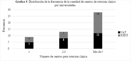 El ICEST ofrece mayor disponibilidad de centros de rotación, indicando que 16 participantes reportaron más de 3 centros de rotación, mientras que en la UAT 12 egresados refirieron la presencia de más de 3 centros, lo cual puede enriquecer la experiencia clínica de los estudiantes antes del egreso.