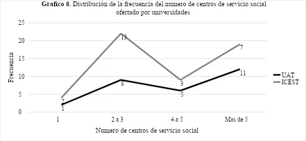 La UAT destaca en la oferta de más de 5 centros de servicio social con 11 respuestas, lo que sugiere una red más amplia de espacios comunitarios o institucionales para prácticas formativas al final de la carrera, mientras que el ICEST la mayoría reporto presentar de 2 a 3 centros de rotación lo cual representa 13 respuestas.