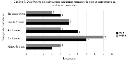 Ambas universidades muestran un patrón similar de tiempo de contratación de 1 a 3 meses, sin embargo, el ICEST destaca solo por la frecuencia de los participantes con 9 personas, frente a 7 personas de la UAT, del ICEST 3 egresados no fueron contratados y de la UAT 4 participantes.