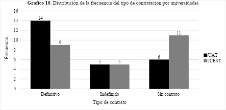 Los egresados de la UAT mostraron una mayor proporción de contratos definitivos 14 en comparación con los del ICEST 9 , la categoría de contrato indefinido se presentó en 5 personas de ambas instituciones, sin embargo, destaca que 11 de los egresados del ICEST no contaba con contrato formal, frente a 6 en la UAT.