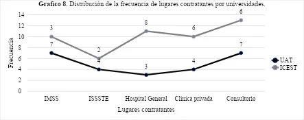 Los egresados de la UAT reportaron mayor inserción en el IMSS y consultorios, ambos con 7 personas (28%), el lugar que menos personal contrato fue el Hospital General con 3 personas (12%), en contraste en el ICEST, la mayor proporción de contrataciones ocurrió en hospital general 8 (32%) y la menor en ISSSTE con 3 (12%), esto muestra diferencias institucionales, donde los egresados de la UAT se vincularon más con el sistema de salud público federal, mientras que los del ICEST tuvieron mayor presencia en hospitales generales y el ámbito privado.