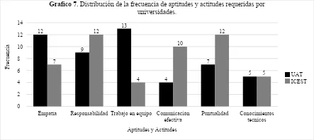 Las cualidades más demandadas fueron, trabajo en equipo, seguido por empatía, responsabilidad y puntualidad  de manera general, los aplicantes del ICEST valoraron especialmente la responsabilidad (12) y la puntualidad (12) mientras que los de la UAT las cualidades más demandadas fueron trabajo en equipo (13) y empatía (12).