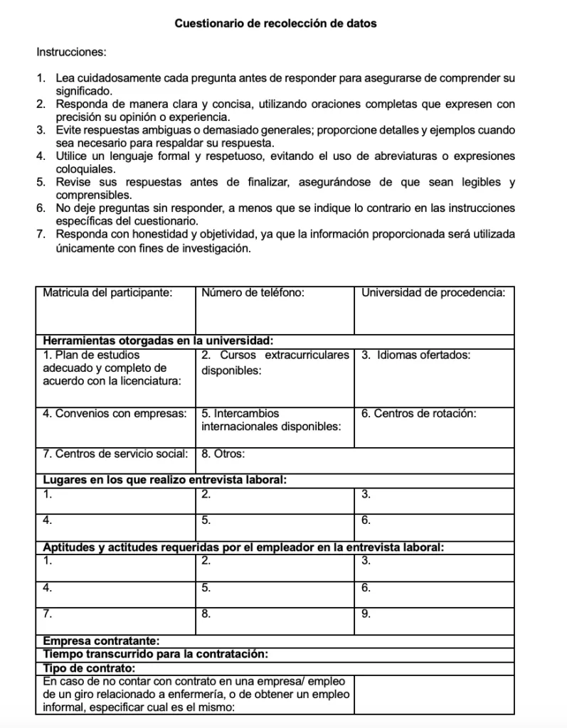 Se diseñó un cuestionario de preguntas abiertas, el cual está conformado por 10 ítems, está estructurado en secciones que incluyen información del participante, competencias adquiridas, experiencia en la búsqueda de empleo y la inserción laboral, la información recopilada permitió un análisis detallado de la relación entre la formación universitaria y las oportunidades laborales de los egresados en el ámbito de la enfermería.